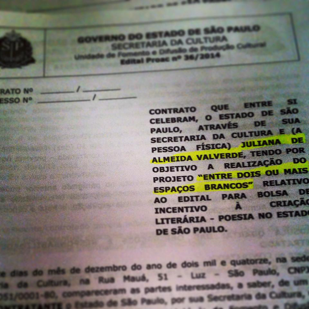Entre dois ou mais espaços brancos é a sua primeira publicação no gênero poesia e foi desenvolvida com o incentivo do ProAC-SP - Editais/2014.